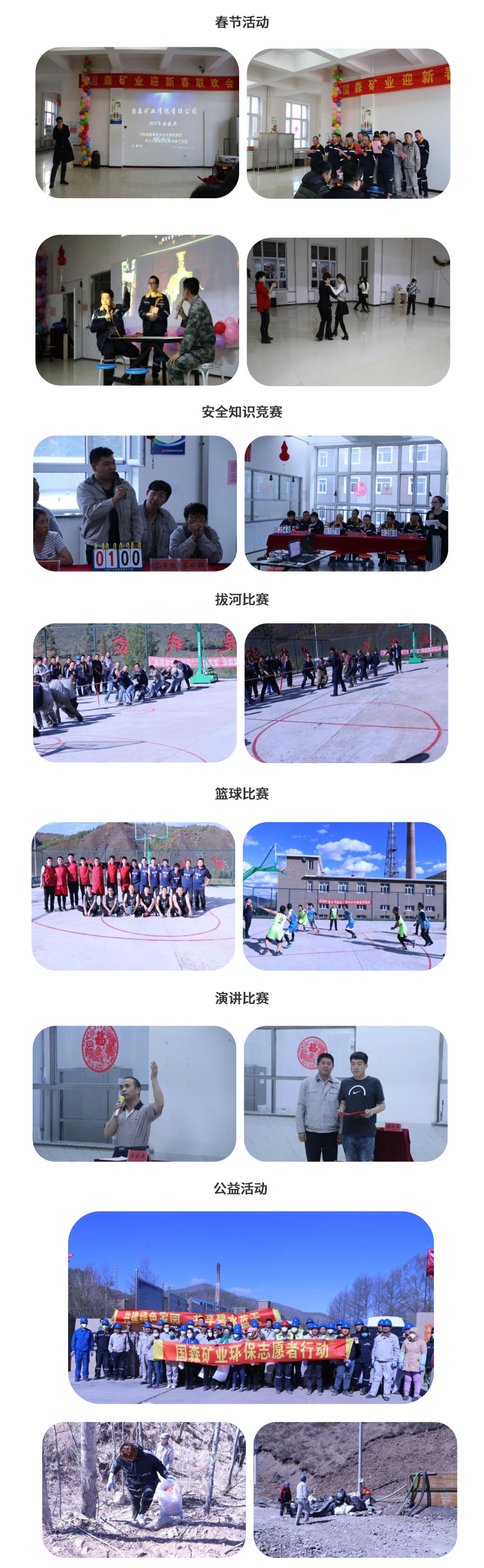 文化活動(dòng):在節(jié)日期間,在員工工作之余,公司組織豐富多彩的文體活動(dòng),豐富員工業(yè)余生活,增強(qiáng)員工團(tuán)隊(duì)意識(shí)和凝聚力;組織安全知識(shí)競賽及安全培訓(xùn),不斷提高員工安全風(fēng)險(xiǎn)意識(shí),規(guī)避風(fēng)險(xiǎn)技能大大增強(qiáng);開展“我愛礦山”“綠水藍(lán)天”環(huán)保公益活動(dòng)等,積極參加綠色礦山建設(shè)。組織車間開展技能比武活動(dòng)、演講比賽,提高員工自身技術(shù)素質(zhì)。
